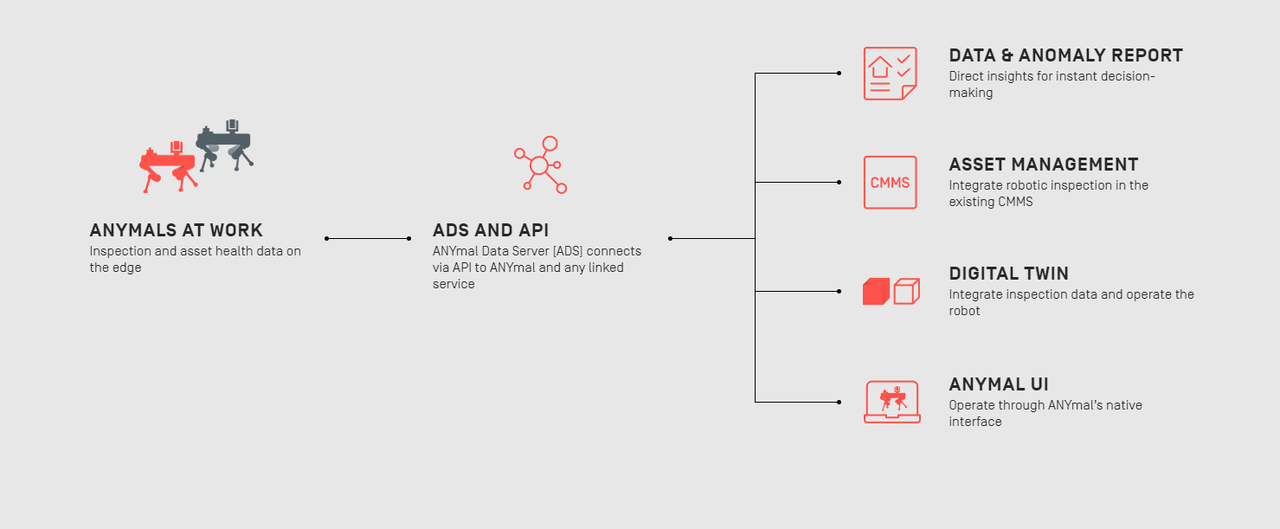 ANYmal samlar in data autonomt, krypterar och sedan överför via ANYmal´s API till lokal server eller Molnet.